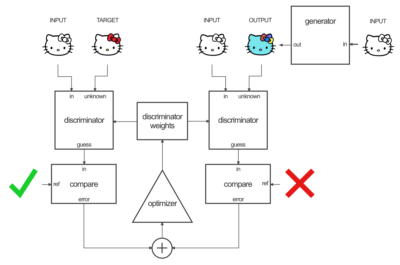The discriminator is trained to recognize whether or not a given image comes from the training dataset. The generator is trained to generate images that “fool” the discriminator